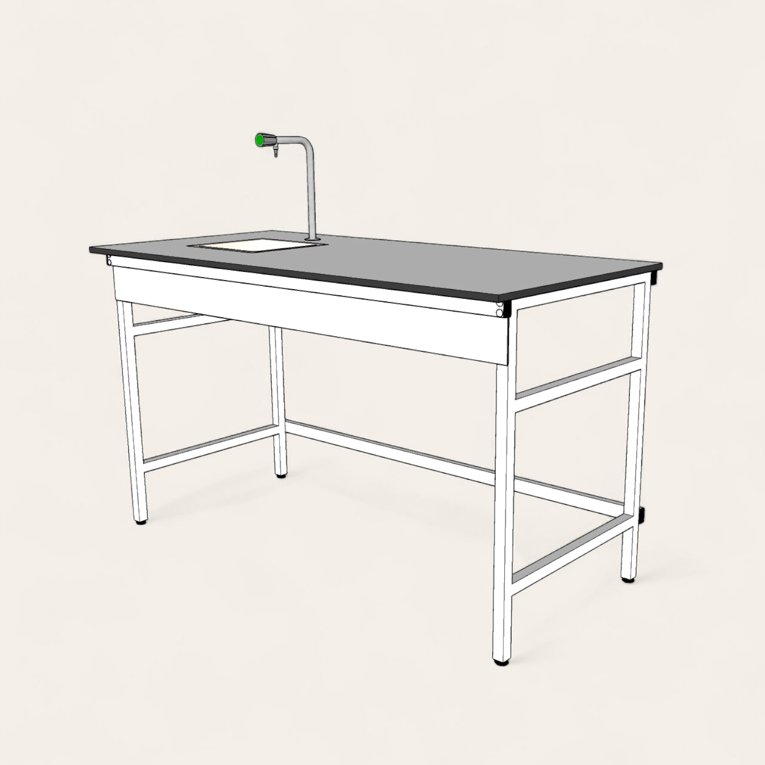 Chassie modulaire robuste en tube d’acier de 30*30 mm, piétement à vérin de mise à niveau, peinture époxy RAL Blanc, plan de travail en HPL 16 mm Garantie 10ans ,anti acide ,anti rayure , anti bacterien, anti statique, avec Evier en Polypropylène anti acide Garantie 2 ans 300*300 mm et Robinet de Laboratoire Garantie 10ans simple sans mélangeur.